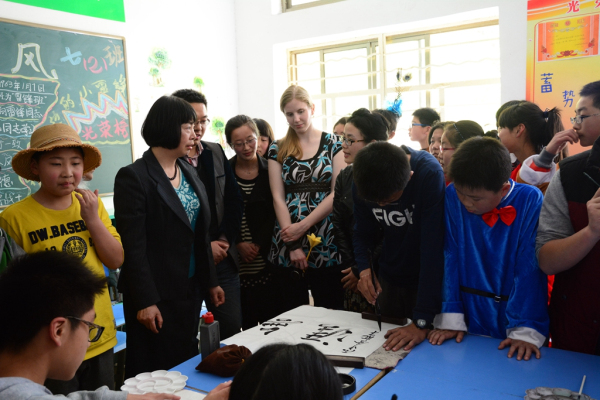 隨后,Emily校長觀看了學(xué)生書法、國畫、勾勒臉譜的現(xiàn)場演示,對(duì)于中國傳統(tǒng)文化表現(xiàn)出濃厚的興趣。同學(xué)們把各自作品送給Emily校長作為紀(jì)念,Emily愉快地接受,并與同學(xué)們開心地與同學(xué)們合影。